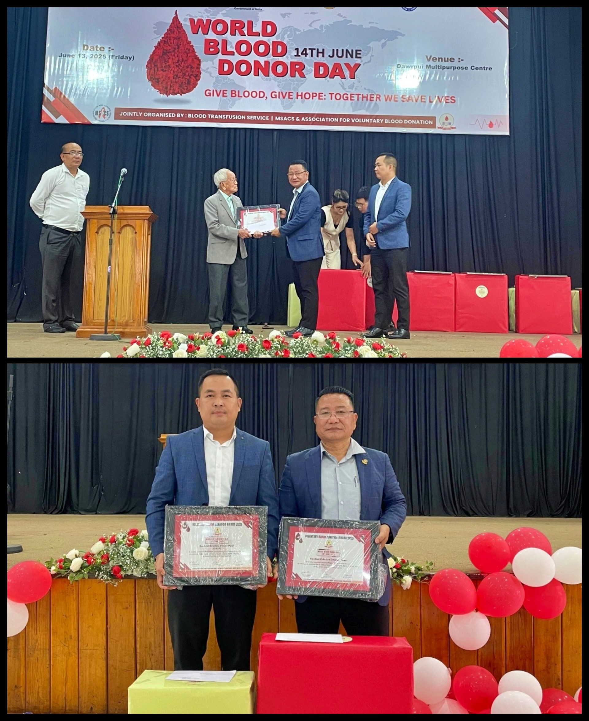 MSACS leh Association for Voluntary Blood Donation (AVBD) ten World Blood Donor Day puala thisen pe tute chawimawina hun an buatsaihah CKTP aiawhin Rev. H. Lalawmpuia, Leader leh T. Upa Lalremsiama Khiangte, committee member te an tel a. He hunah hian KTP ten thisen pek tam lamah Religious Category-ah Pakhatna leh Overall Category-ah Pahnihna an dawng a ni.