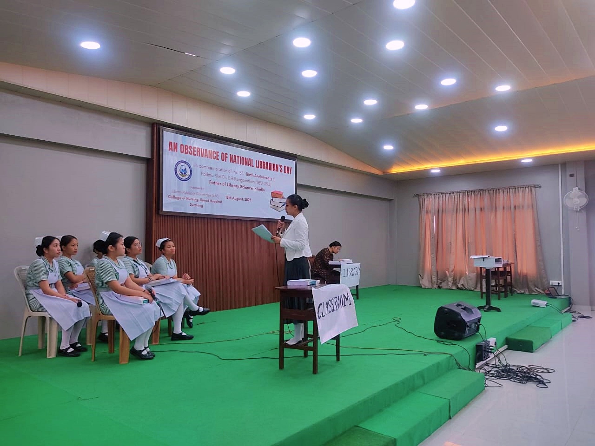 He lawmna hun hi College of Nursing, Synod Hospital, Durtlang chuan an mahni College Multipurpose Hall-ah mithiamte sawmin hun an hmang a. Hun hmannaah hian Pu Z.D. Lalhmingliana’n hunserh a hmang a. College Principal Pi C. Lalrintluangi’n inlawmna thu a sawi a. College Librarian Dr. Lalbiaksanga Hnamte in Dr. S.R. Ranganathana chanchin sawiin Library report-a pe bawk. India ram President-in Award-a hlan, kumin 2025 -a National Florence Nightingale Award dawngtu Pi V. Lalhmangaihi, Nursing Officer, Civil Hospital chu sawm niin kalkhawmte fuihna thu a sawi. Librarian’s Day theme Developing Reading habits: an immediate need tih chu Dr. R. Lalengmawia, Librarian & HOD, Zoram Medical College & Hospital chuan sawiin zirho a ni. Zirlaite pawhin Item neiin Library pawimawhna lantirna Skit te an rawn entir bawk a, hlawk taka hun hman a ni.
