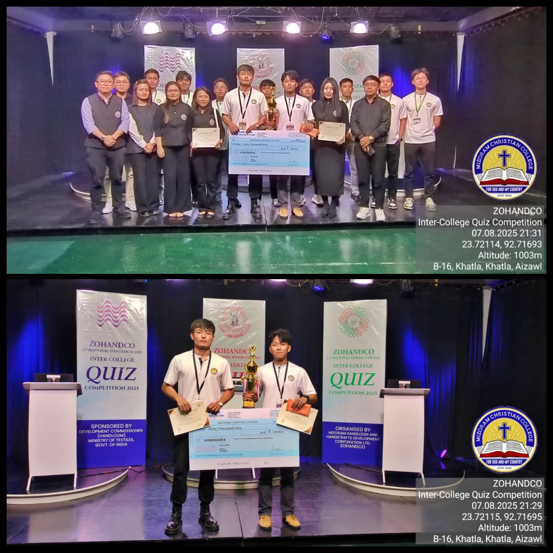 Zohanco 11th National Handloom Day Inter College Quiz Competition 2025-ah Mizoram Christian College chuan pakhatna dinhmun an hauh a, MCC aiawha telte hi – Rohmingliana Renthlei, 5th Semester (Political Science), Remsiamkima, 5th Semester (BBA) leh C. Lalfakzuala, 3rd Semester (Sociology) te an ni.